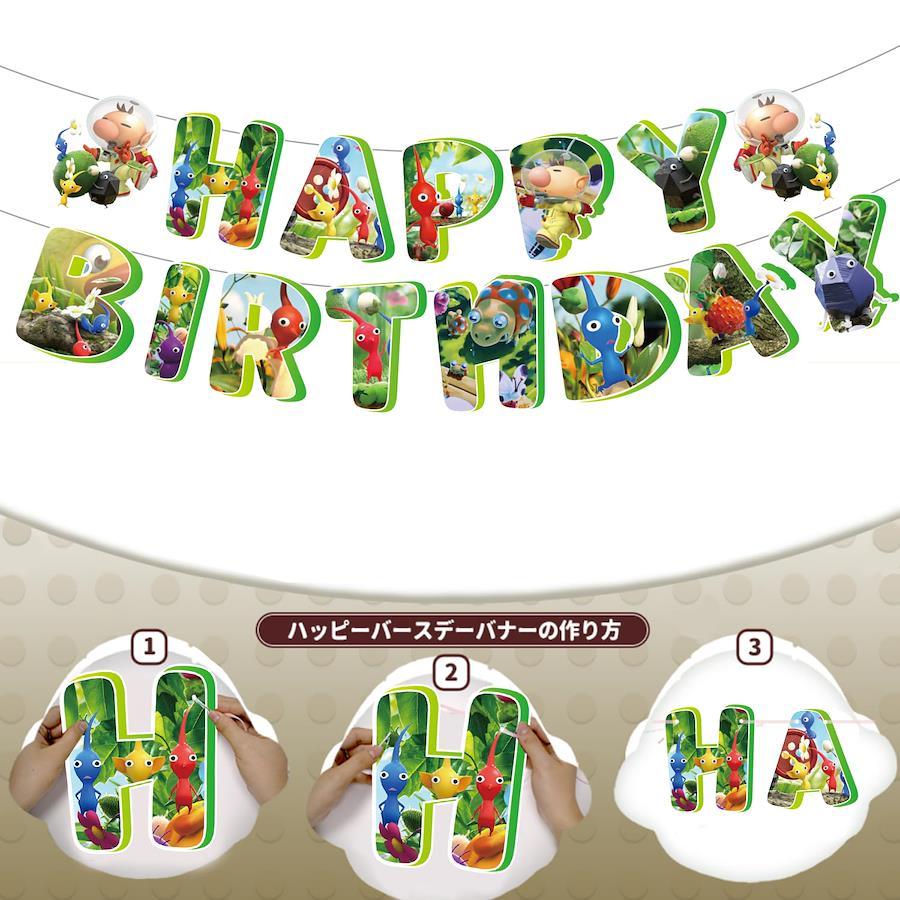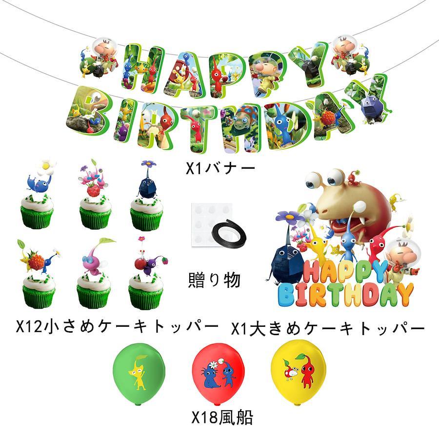 ①ハッピーバースデーバナー×1個②ケーキトッパー×13個(大*1、小*12)③風船×18個④テープシート⑤リボン