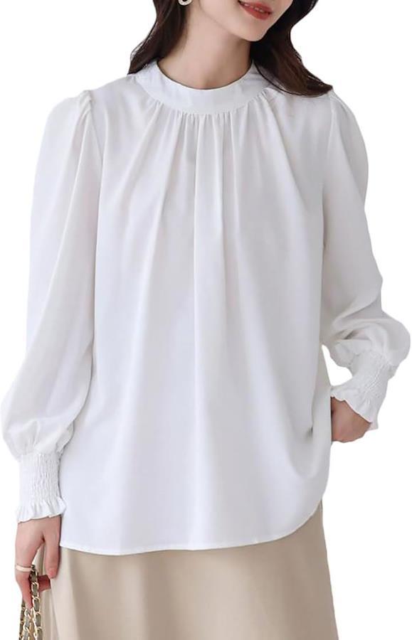 ポイント(2):立体感のあるデザインで胸元タックや袖口のギャザーxシャーリングデザインが立体感のあるシルエットを創り出し、シンプルながらもこなれ感のある着こなしに。
