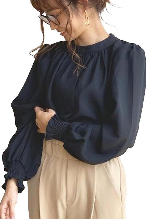 ポイント(2):立体感のあるデザインで胸元タックや袖口のギャザーxシャーリングデザインが立体感のあるシルエットを創り出し、シンプルながらもこなれ感のある着こなしに。