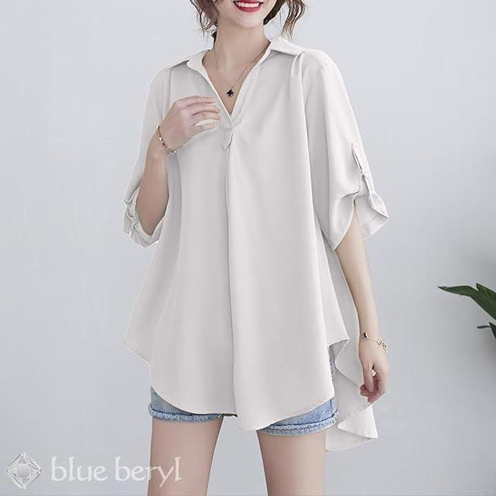 「こだわりのディテールでスタイルアップ」 スキッパータイプの深めに空いた胸元が、Vカットを強調して顔周りをスッキリ シャープに演出。