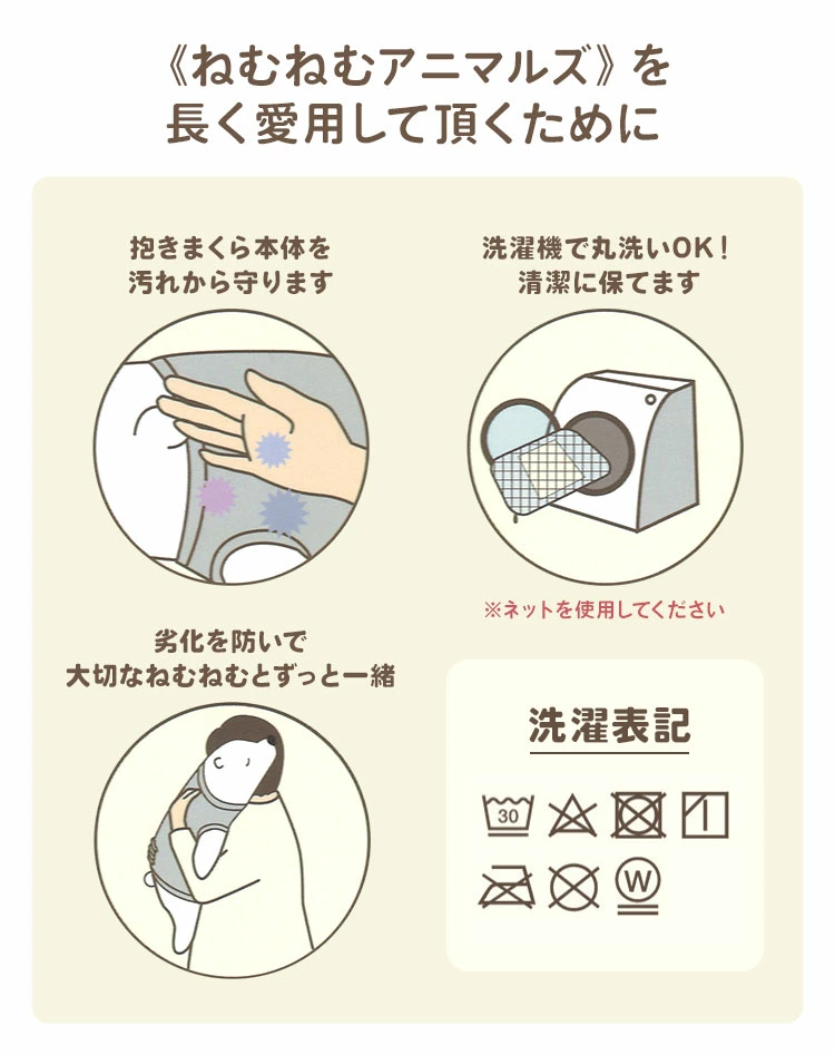 ●抱き枕本体を汚れから守ります。●カバーは、洗濯機で丸洗いOK!清潔に保てます。●抱き枕の劣化防止になります。●プレミアムねむねむアニマルズと同じ《もっちり生地》を使用♪触り心地も抜群◎