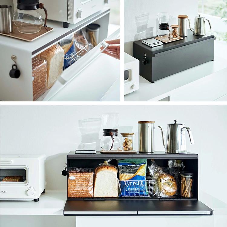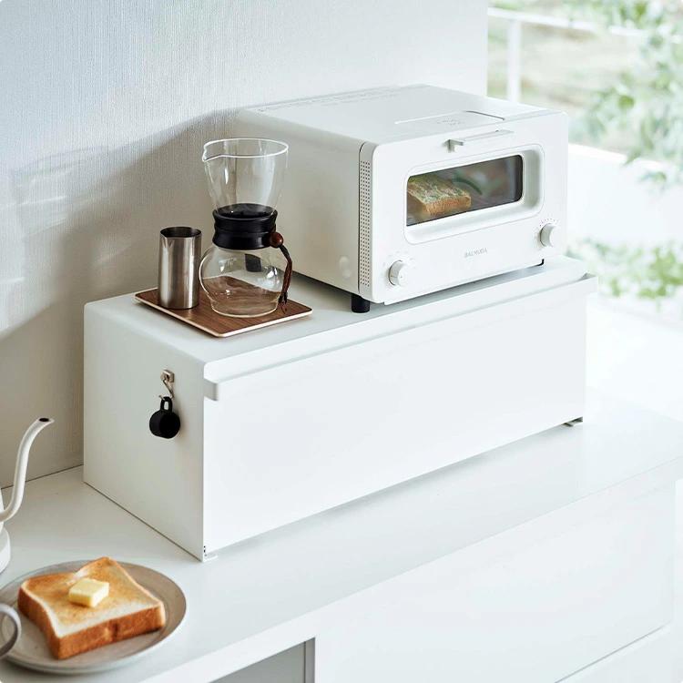 【ブレッドケース ワイド】パンや調味料、紅茶などをすっきりとまとめて収納できる32Lのワイドなブレッドケース。キッチンカウンターなどで雑然としがちなパンやお菓子、調味料などを隠しながら美しく収納できる収納ケースです。フラットな天板の上にはトースターなどを置くこともでき、朝食の準備もスムーズになります。マグネットがつくスチール素材なので側面にフックなどで小物をかけて収納できます。