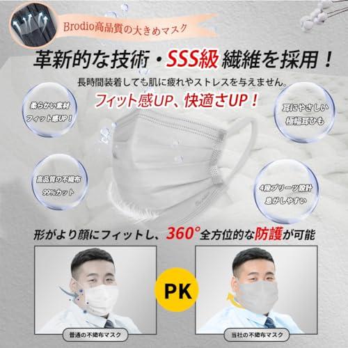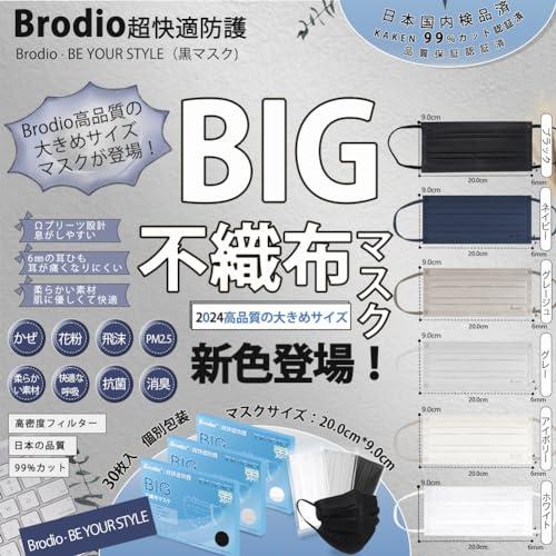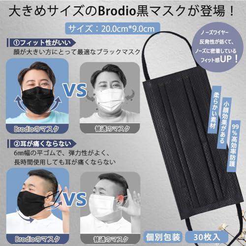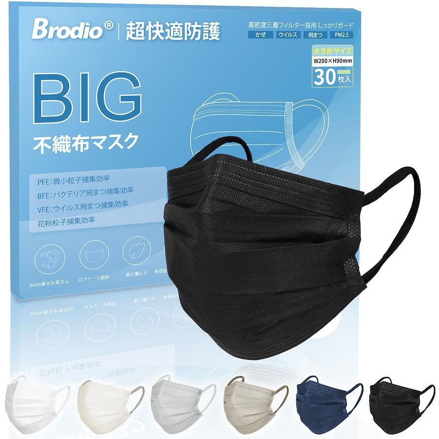 【大きめ?黒マスク】待望のBrodio超大きめ黒色マスク新登場!!【Point①】多くのお客様にご愛顧頂いているBrodioレギュラーサイズ黒色マスクから、皆様のご要望にお応えし「超大きめサイズ」をリリース!マスクサイズ「20cm×9cm」、耳紐幅「6mm」、長さや伸び具合なども改良。多くのお客様のご意見を元に開発した商品ですので、より多くのお悩みを解決できる自信作でございます。【Point②】マスクはこれまでと同じ上質な素材を使用しながらも、より柔らかく、より肌に優しく仕上げました。【Point③】毎日を快適に過ごしてほしい。そんな想いから、マスクプリーツを「三つ折り」から「四つ折り」にアップグレード!さらに呼吸がしやすくなりました♪【Point④】マスク表裏どちらも黒色で仕上げ、汚れによる不快感なく1日快適に過ごせます。(マスクお色に関しましてはまだまだお客様からのご要望にお応えしたいと思っております。ご意見お待ちしております。)【日本KAKEN検品?99%カット】三層構造の高密度フィルターを採用!日本権威的な検定機関KAKENのカケンテストをクリア!高い防護性能はBrodio快適さの前提となっています。日本の検査機関でフィルター性能の検査を行い、(微粒子)PFE99.6%、(バクテリア飛沫)BFE99.6%、(ウィルス)VFE99.5%以上、安心・安全の高品質フィルターを使用し、花粉や細菌を99%カット。【Ωプリーツ設計?超快適防護】上下向き4段プリーツのデザインは、口元に空間を作り、同時に、マスクで肌荒れが起こりますことを減少し、毛羽立つを防ぐ効果があります、それに、ノーズワイヤーと全方位のフェット構造も、顔とマスクの隙間が少なくなります。【個別包装?便利?清潔】Brodioマスクは一枚一枚の独立包装で、市場にある非独立包装のマスクに比べて、Brodio個別包装マスクはより清潔、携帯に便利です。Brodioマスクは出荷前、すべて紫外線による消毒を受けております。出勤・通学・食事会・デート・出張・観光など、いつでもどこでも持ち歩くことができます。【基本情報】[サイズ]大きめサイズ:約20cm×9cm。[カラー]ブラック/ホワイト/グレー/グレージュ/ネイビー/アイボリー。30枚入。※マスクは1枚ずつの個別包装で、使い捨てになります。[製造国]中国 ※安全で適正な商品であることを 証明するCE・FDAマーク取得 国際基準をクリアした 品質管理が徹底されたISO取得工場で製造。今後とも弊社の商品をご愛顧いただきますよう、ご購入の日より一年間のアフターサービスをご提供いたします。不良品やご不明な点があれば、ぜひの購入履歴より、弊社にご連絡ください。