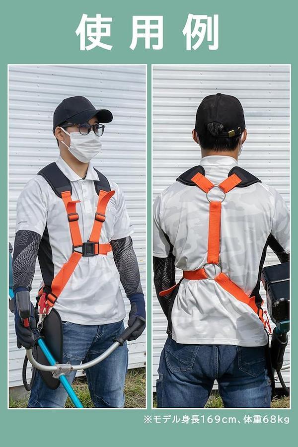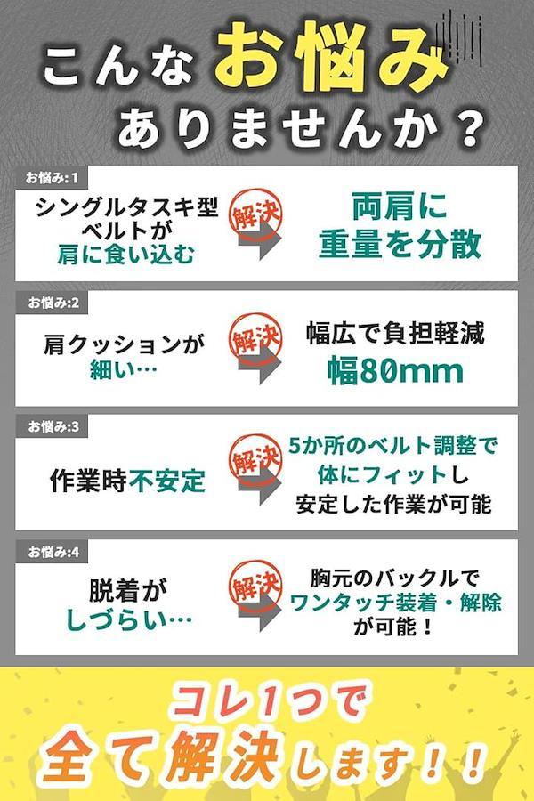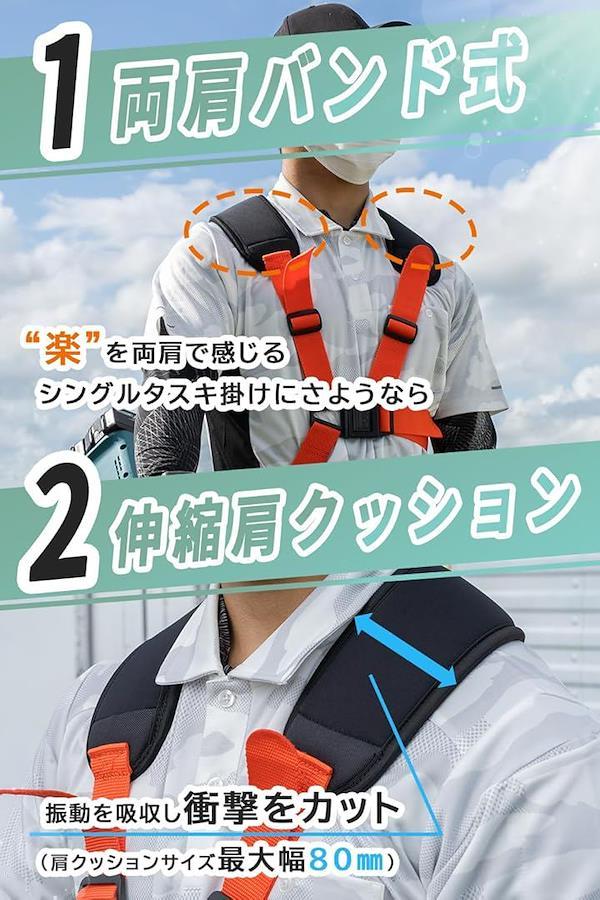 両肩で重さを均等に支えることで、長時間の作業でも疲れにくく快適にお使いいただけます。