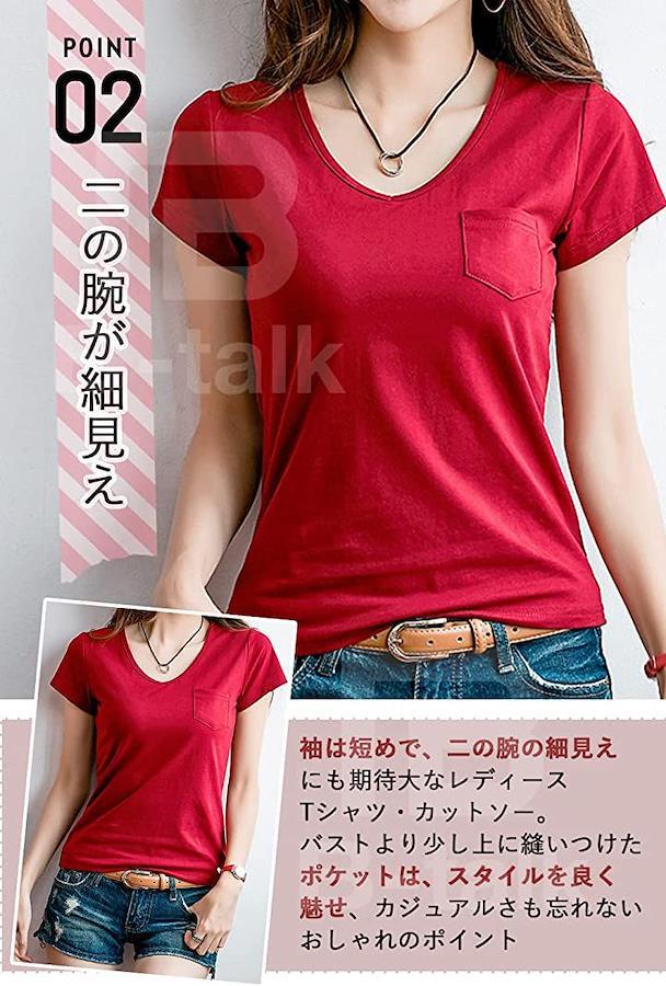 袖は短めで、二の腕の細見えにも期待大なレディースTシャツ・カットソーです。