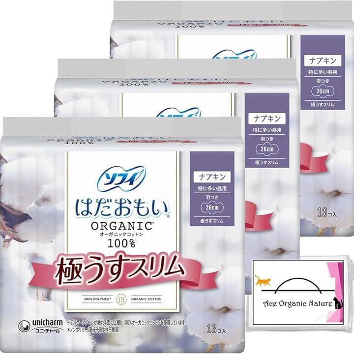 「まとめ買い」ソフィ はだおもい オーガニックコットン 極うすスリム 特に多い昼用 羽つき 26cm 13枚 x 3個セット (合計39枚)