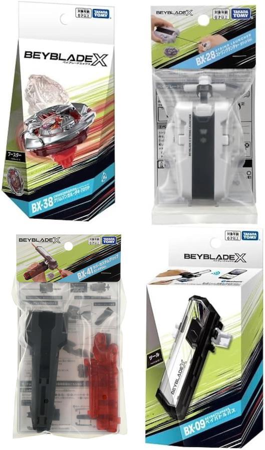 【BX-38】上面はスタミナロスが少なく、底面はカウンターに優れた攻撃と上下で性能が異なるブレードと、高さが切り替えられるビットにより、様々な高さの相手への対応力に優れたベイ。【BX-41】ランチャー(別売り)に装着するツール。握りやすい形状で、シュートの安定性を向上させる。 ラバー製のパネルをカスタマイズすることで握りやすさを調節可能にしたグリップのガンメタVer.【BX-28】(別売り)をシュートするためのツール。紐を引くことでベイをシュートできる専用ランチャーのホワイトカラーVer。【BX-09】シュートパワーを計測・記録できるツール。専用アプリと連携することでシュートパワーに応じたベイポイントをアプリ内で獲得。ベイポイントを貯めるとレアベイが当たるゲームに挑戦できる。