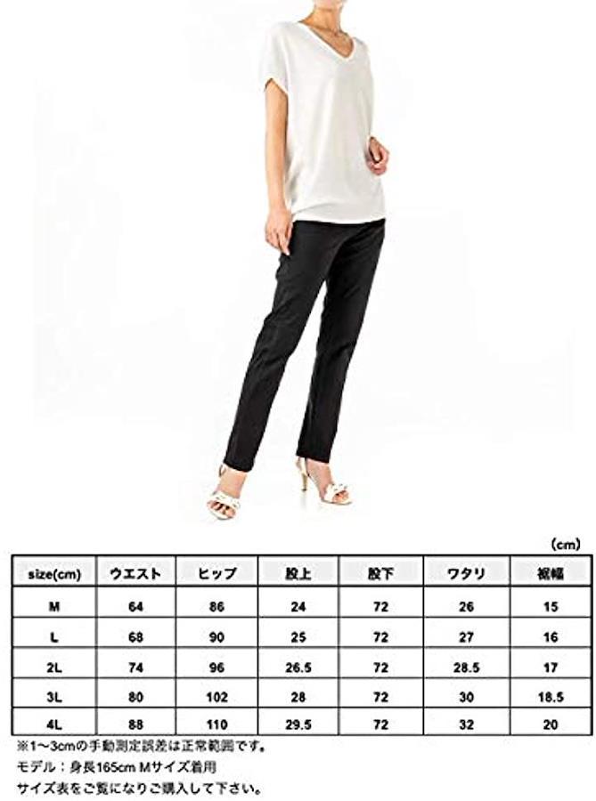 ・「サイズ」[Mサイズ] ウエスト:64cm、ヒップ:86cm、股上:24cm、股下:72cm、ワタリ:26cm、裾幅:15cm [Lサイズ] ウエスト:68cm、ヒップ:90cm、股上:25cm、股下:72cm、ワタリ:27cm、裾幅:16cm [LLサイズ] ウエスト:74cm、ヒップ:96cm、股上:26.5cm、股下:72cm、ワタリ:28.5cm、裾幅:17cm [3Lサイズ] ウエスト:80cm、ヒップ:102cm、股上:28cm、股下:72cm、ワタリ:30cm、裾幅:18.5cm [4Lサイズ] ウエスト:88cm、ヒップ:110cm、股上:29.5cm、股下:72cm、ワタリ:32cm、裾幅:20cm