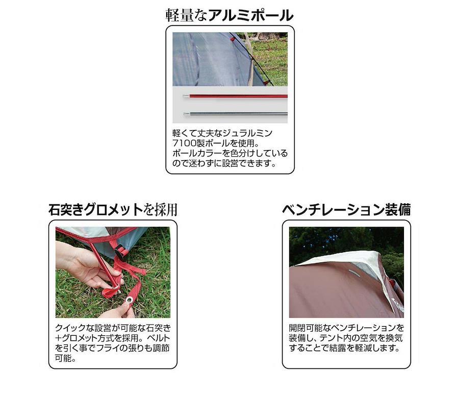 広く高さのある前室と荷物室兼用後面出入口を装備。ポールを色分けする事で設営も迷わずスピーディー。快適装備をプラスしたソロテントです。軽量なアルミポール! 軽くて丈夫なジュラルミン7100製ポールを使用。ポールカラーを色分けしているので迷わずに設営できます。ベンチレーション装備! 開閉可能なベンチレーションを装備し、テント内の空気を換気することで結露を軽減します。石突きグロメットを採用! クイックな設営が可能な石突き+グロメット方式を採用。ベルトを引く事でフライの張りも調節可能。前・後面は出入口兼荷物室! 前室には、高さと広さを持たせたワイドな出入口。後室にも出入口を装備し、前室が荷物で塞がっていても出入りができます。収納や持ち運びに便利なバッグ付。インナーテントウォールには、通気性の良いノーシームメッシュ。縫い目からの雨の侵入を防ぐシームレス加工。レンタル等による貸出し、オークション等による転売や中古販売、及び譲渡によって発生した事故・損傷・劣化・損害・事故などにつきましては、一切責任を負いかねますので予めご了承ください。