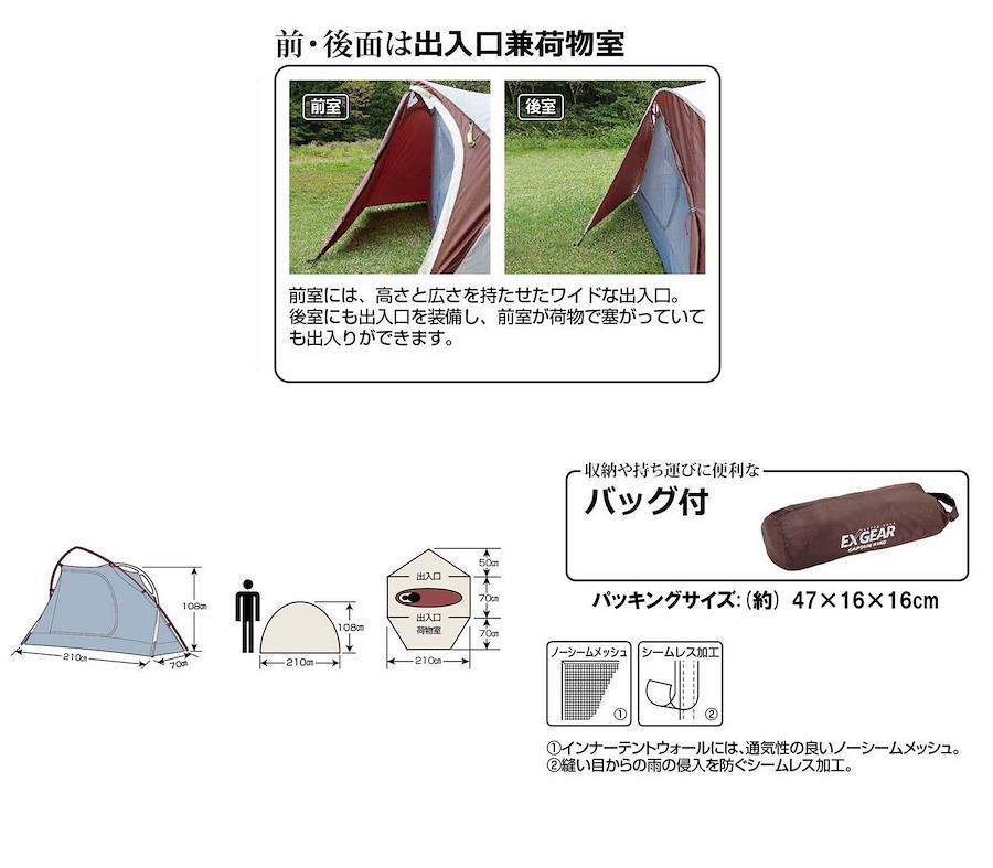 製品サイズ(約):フライ:210×190×H130cm、インナー:210×70×H108cm重量(約):2.18kgクイックな設営が可能な石突き+グロメット方式を採用。開閉可能なベンチレーションを装備し、テント内の空気を換気することで結露を軽減します。原産国:中国