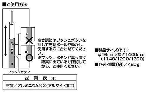 製品サイズ:(約)Φ16×長さ1400mm(1148/1200/1300)仕様:高さ4段階 1148・1200・1300・1400mmセット重量:(約)480g材質:アルミニウム合金(アルマイト加工)原産国:中国