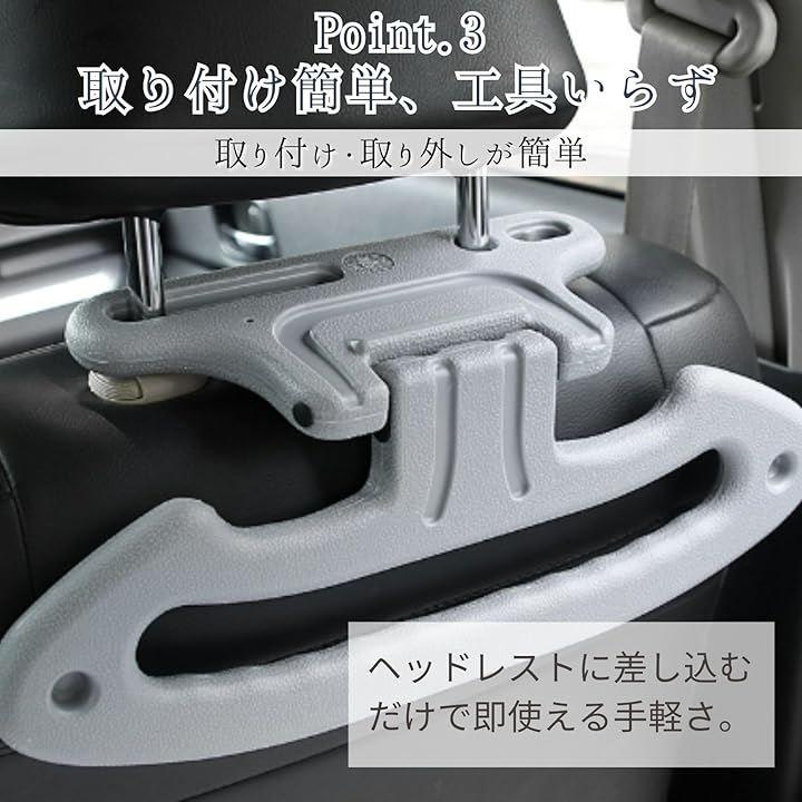 「取り付け・取り外しが簡単」工具不要で、ヘッドレストの支柱にフックをかけるだけで簡単に取り付けられます。