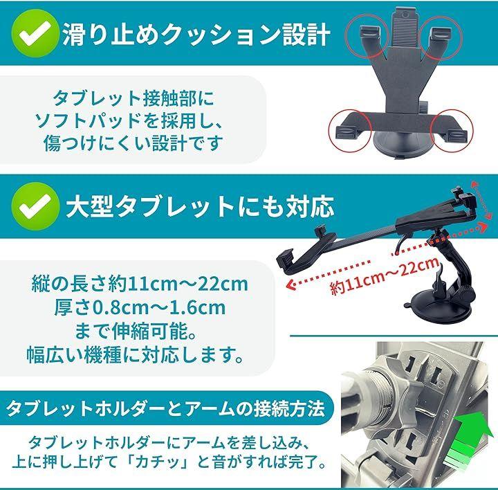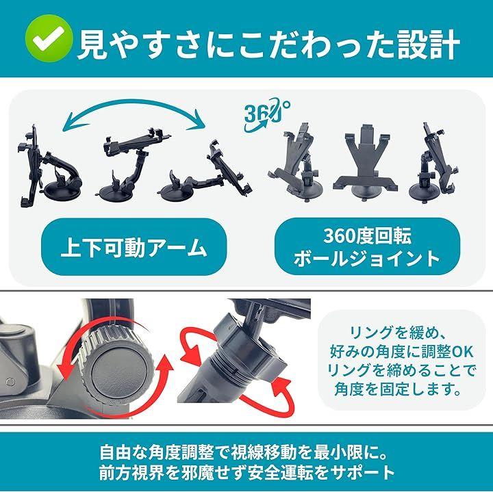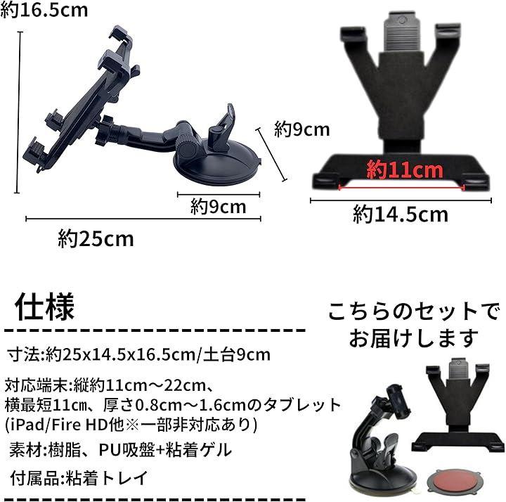 「仕様」 サイズ:約25x16.5x9cm(最長時) 対応端末:縦約11cm~22cm、横最短11cm、厚さ0.8cm~1.6cmのタブレット(iPad/Fire HD他*一部非対応あり) 取付方式:吸盤+ゲルパッド式(ダッシュボード推奨) 可動範囲:上下左右調整/360°回転 カラー:ブラック