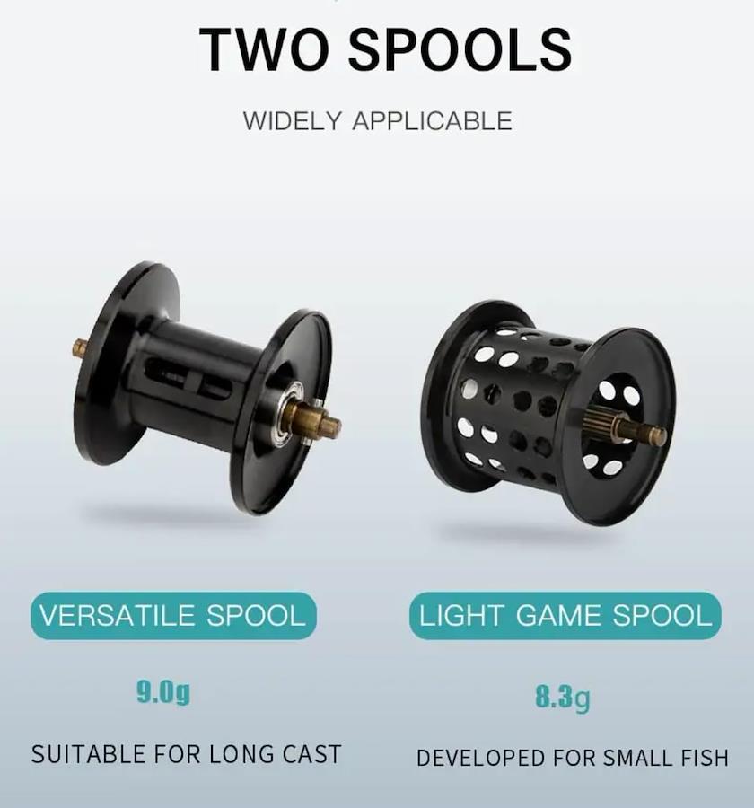 なんといってもコスパ最強、いろいろな魚種に適応するベイトリールです。 ①通常スプールとフィネススプールがついているため、この1台で高比重ワームの遠投から2gの軽量ルアーまで対応可能です。 ②自重が150g台で軽量コンパクトなので疲れにくく、手の小さな女性やお子様にもオススメです。 ③光の当たり方で色が変化するマジョーラカラーで、お値段以上にカッコいい! バス釣りや渓流のベイトフィネス、海でのチニング等、もしくはお子様用や予備機としていかがでしょうか。