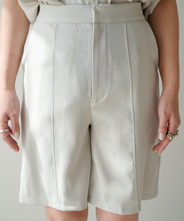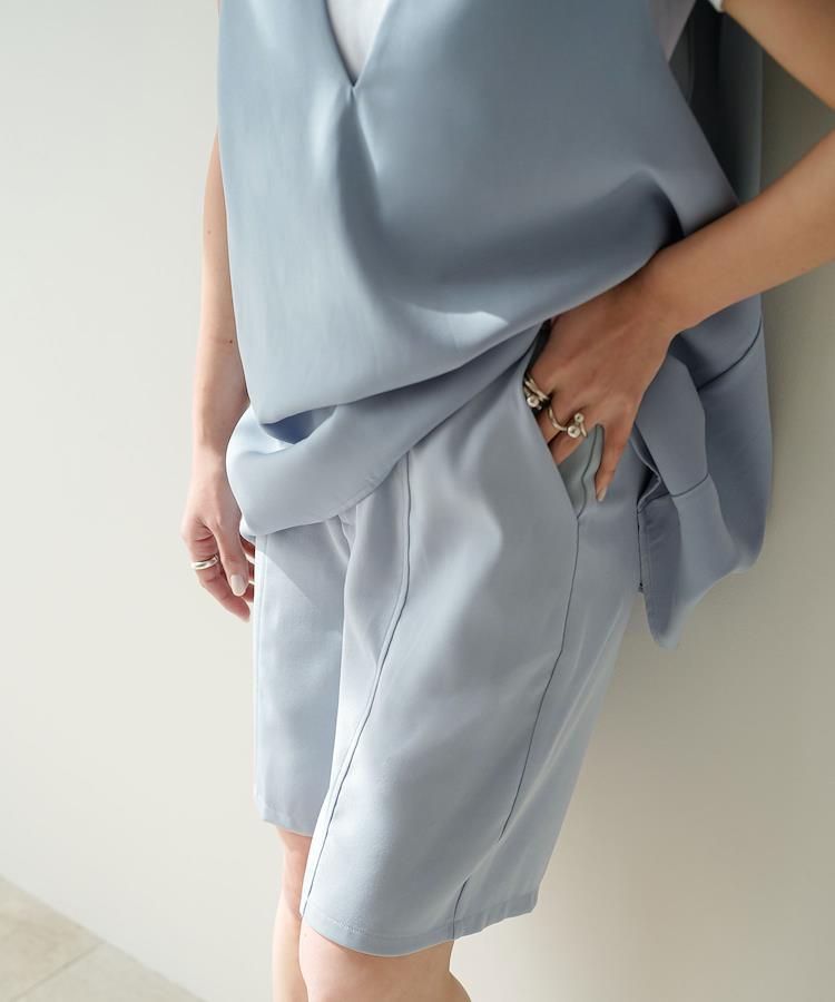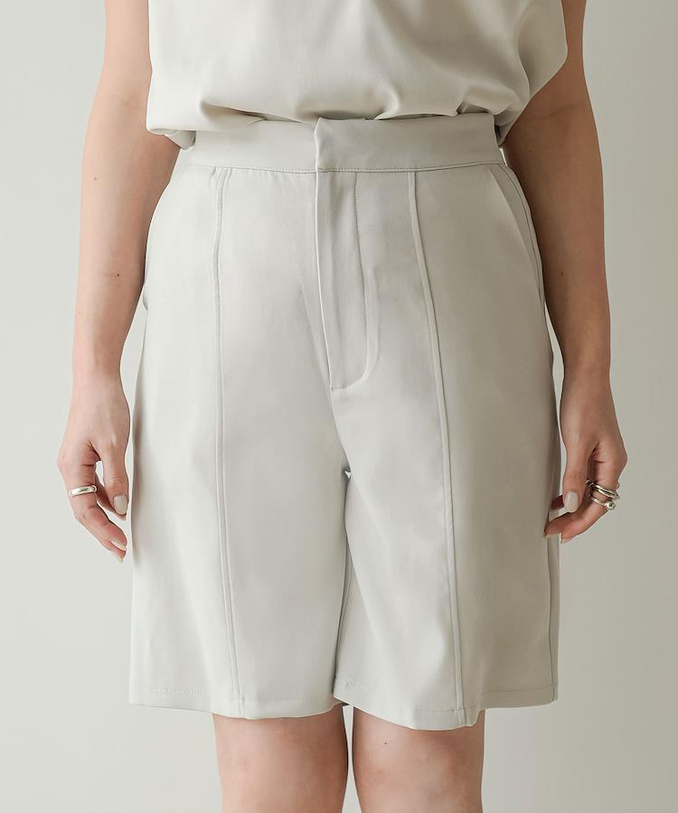 ベストとのセットアップもOKきれいめに履ける大人のハーフパンツ【ディティール】フロントに切り替えを入れ縦ラインを強調することでスタイルアップ効果も期待できるハーフパンツ。裾回りにゆとりを持たせたキュロット型シルエットで足を細く見せてくれるのも嬉しいポイント。ハイウエストで腰回りをすっきりと見せてくれます。春夏らしい爽やかな淡色カラーで揃えました。【スタイリング】同素材のベストでセットアップとしてコーディネートして頂けます。とろみのある上品な素材が、ハーフパンツでもカジュアルになりすぎずきれいめな印象に。今期トレンドの厚底スニーカーやサンダルで足元にヌケ感を出すのもおすすめ◎セットアップで着用できる同素材のベストもご用意しております。品番533250 ショルダータックVネックベスト**********************透け感:なし裏地:なし伸縮性:ややあり光沢感:なし生地の厚さ:普通**********************《生産国》中国
