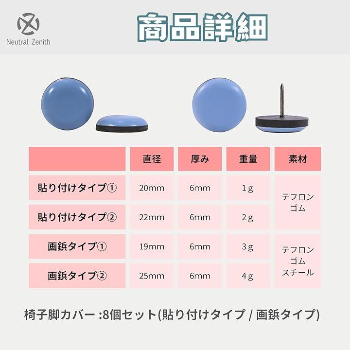 「商品詳細」椅子脚カバー x 8個セット(貼り付けタイプ / 画鋲タイプ) サイズ:(貼り付けタイプ) (1)直径20mmx厚み6mm/重量(約)1g (2)直径22mmx厚み6mm/重量(約)2g (画鋲タイプ) (1)直径19mmx厚み6mm/重量(約)3g (2)直径25mmx厚み6mm/重量(約)4g 素材:(貼り付けタイプ) テフロン/ゴム (画鋲タイプ) テフロン/ゴム/スチール