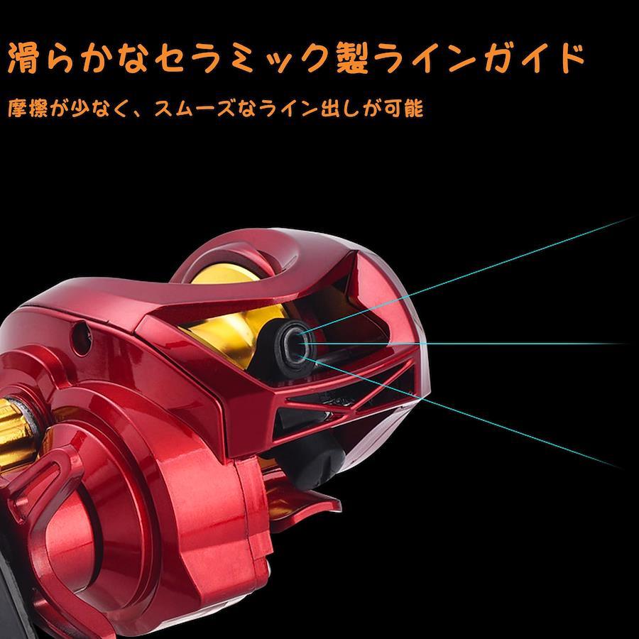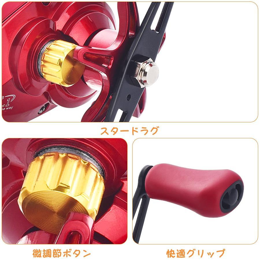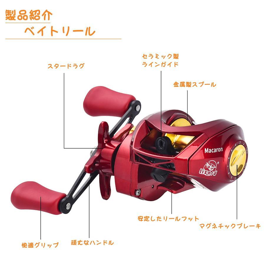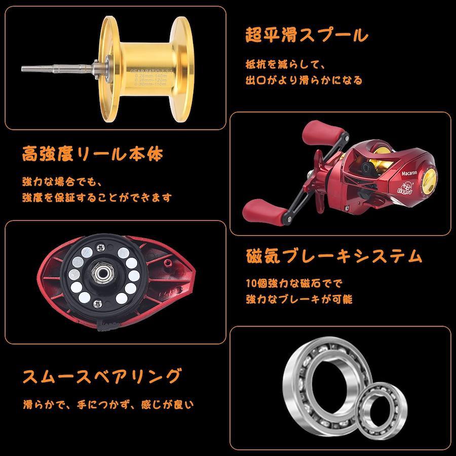 【製品仕様】カラー:レッド ギア比:7.2:1 ドラグ力:10kg タイプ:右ハンドル【スプール糸巻量】 (mm/m): 0.26mm-140mm, 0.30mm-110mm, 0.28mm-120mm【マグネットブレーキ】ベイトリールは12段階調整できる磁気ブレーキシステムを搭載されて、使いやすいてす。大きな魚でも捕まえることができます。【超軽量のデザイン】ベイトリール本体重量はわずか300g、超軽量で長時間に使っても腕に負担をかけません。10kgまでのドラグシステムを搭載します。【スムーズな釣り体験】ベイトリールは高品質の金属製で、摩擦が少なく、丈夫で耐久性があり、スムーズに回転します。