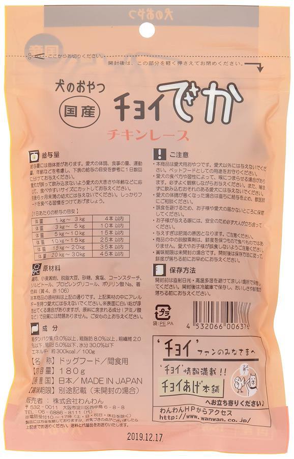 鶏肉、小麦澱粉、脱脂大豆、砂糖、食塩、コーンスターチ、ソルビトール、プロピレングリコール、ポリリン酸Na、着色料(黄4、赤106)