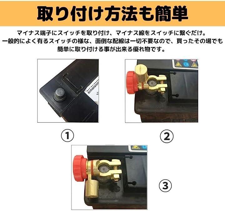 簡単な取り付け:マイナス端子にスイッチを取り付け、マイナス線をスイッチに繋ぐだけ。