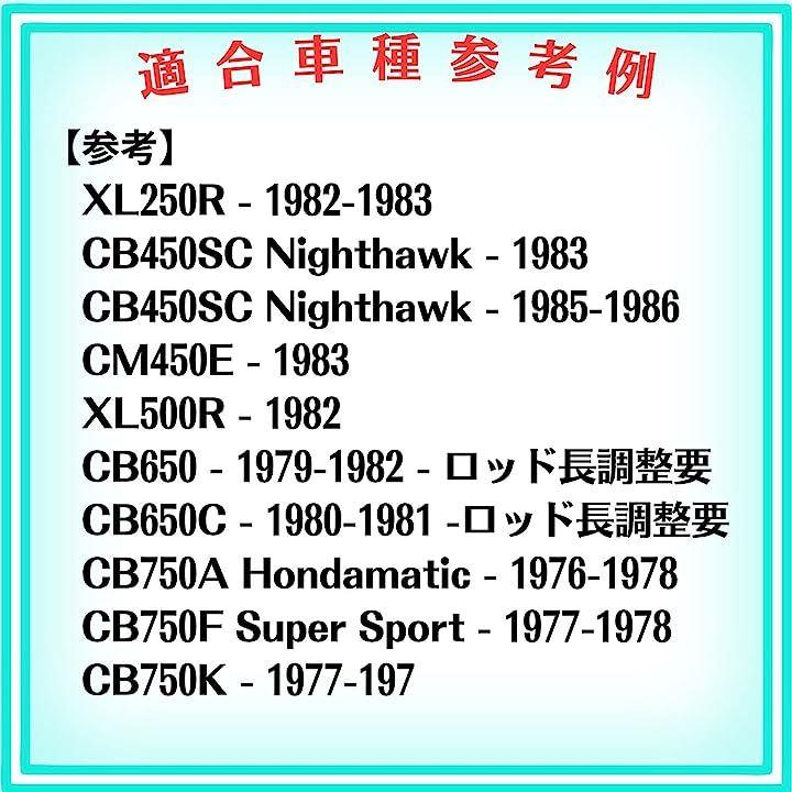 ・「適合車種参考例」 XL250R - 1982-1983、CB450SC Nighthawk - 1983、CB450SC Nighthawk - 1985-1986、CM450E - 1983、XL500R - 1982、CB650 - 1979-1982 、CB650C - 1980-1981、 CB750A Hondamatic - 1976-1978、CB750F Super Sport - 1977-1978、CB750K - 1977-197