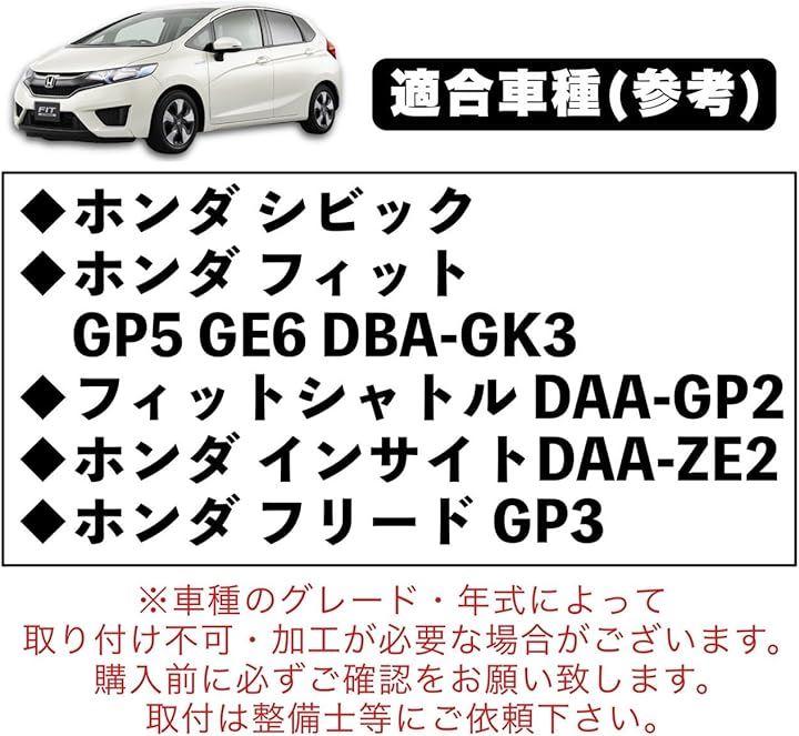 「適合車種(参考)」 ・ホンダ シビック ・ホンダ フィット GP5 GE6 DBA-GK3 ・フィットシャトル DAA-GP2 ・ホンダ インサイト DAA-ZE2 ・ホンダ フリード GP3 等 *車種のグレード・年式によっては、加工が必要な場合や、取り付け出来ない場合がございますのでご購入前に必ずご確認をお願い致します。