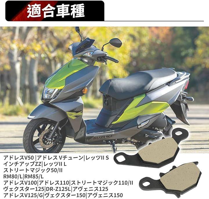 「フロントパッド適合車種」スズキ アドレスV125/G/S(2005-2013)、アドレス110(2015-2018)、アヴェニス150(1998-2005)、ヴェクスター150(1994-2007)、RM80シリーズ(1985-1999)、ストリートマジック110/II、レッツIISなど、30年以上のモデルに対応(*詳細は商品説明の適合車種を要確認)。