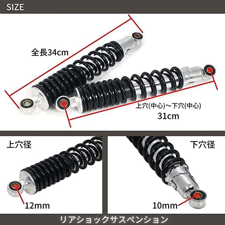 ・*「サイズ(約)」 ・全長:340mm ・取付ブッシュセンター間:310mm ・取付径:上 12mm / 下 10mm (上下で径が異なりますのでご注意ください) ・スプリング線径:7mm