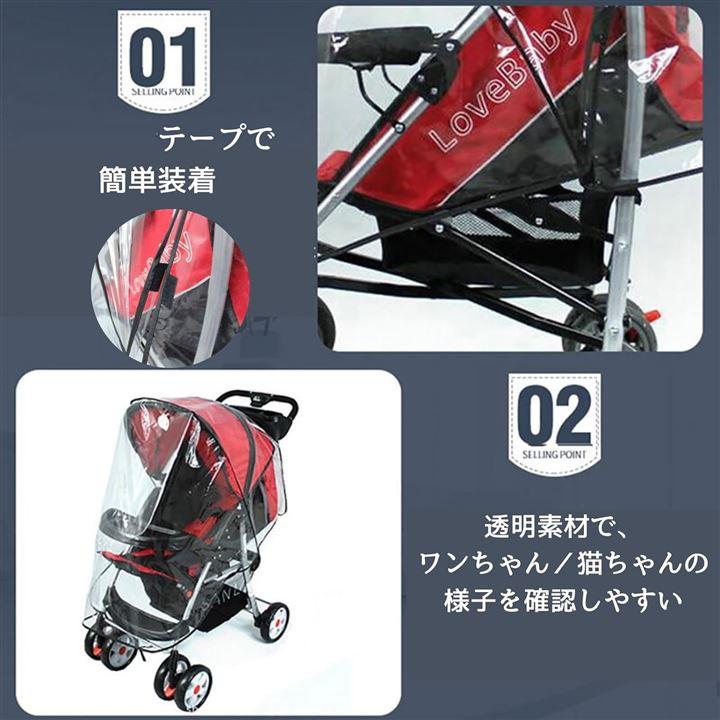 防雨防寒ペットカートカバー、散歩や介護に最適、簡単装着、透明素材、無臭、やわらかい、大型犬不可。