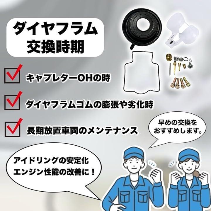 セット内容には重要なパーツであるダイヤフラムやフロートが含まれており、キャブレターのオーバーホールに必要な部品が揃っています。
