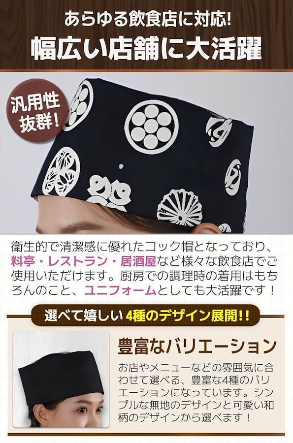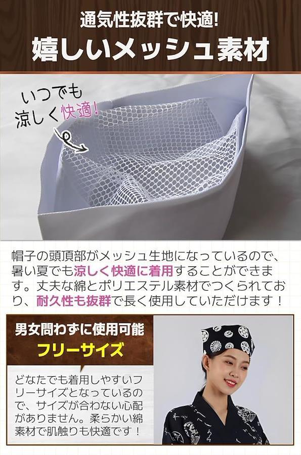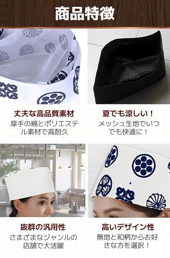 「商品特徴」(1)丈夫な高品質素材:厚手の綿とポリエステル素材で高耐久/(2)夏でも涼しい。:メッシュ生地でいつでも快適に。/(3)抜群の汎用性:さまざまなジャンルの店舗で大活躍/(4)高いデザイン性:無地と和柄からお好きな方を選択。