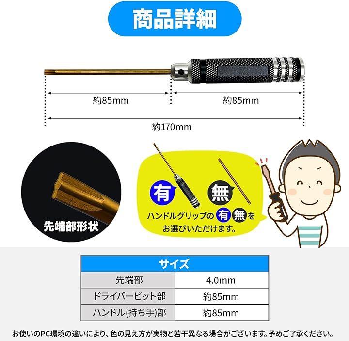 ・「サイズ」先端部:4.0mm ドライバービット部:約85mm ハンドル(持ち手)部:約85mm 「バリエーション」 ハンドルグリップの有無をお選びいただけます。