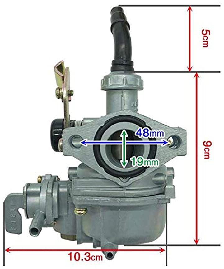 「適合車種」スーパーカブ50/70/90など(カブ50純正のマニホールドはサイズ異なるため不可)キャブレターPZ19(PB16型)メインジェット:72番、スロージェット:32番マニホールド側内径:19mm 、取り付け幅:48mm、エアクリーナー側内径:約32mm、重量:約540g、サイズ(約):W105xD75xH140mm
