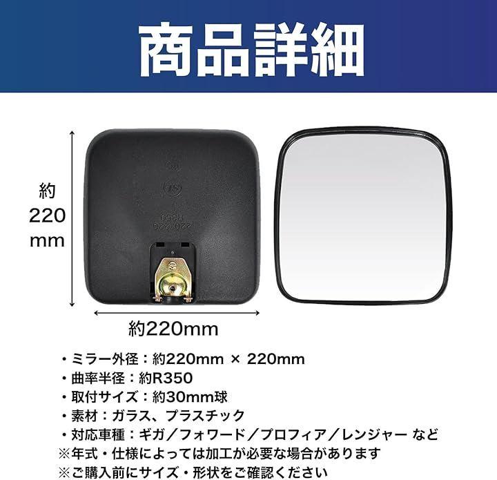 有効寸法 約220mmX約220mm 曲率半径 約R350 取付サイズ 約30mm球 適合車種 ギガ、フォワード 、プロフィア、レンジャー 等 社外品になります。