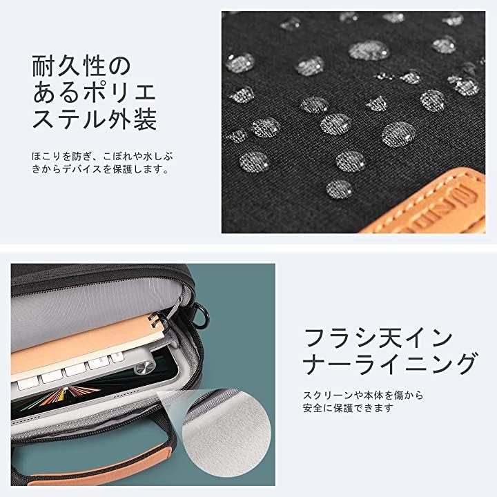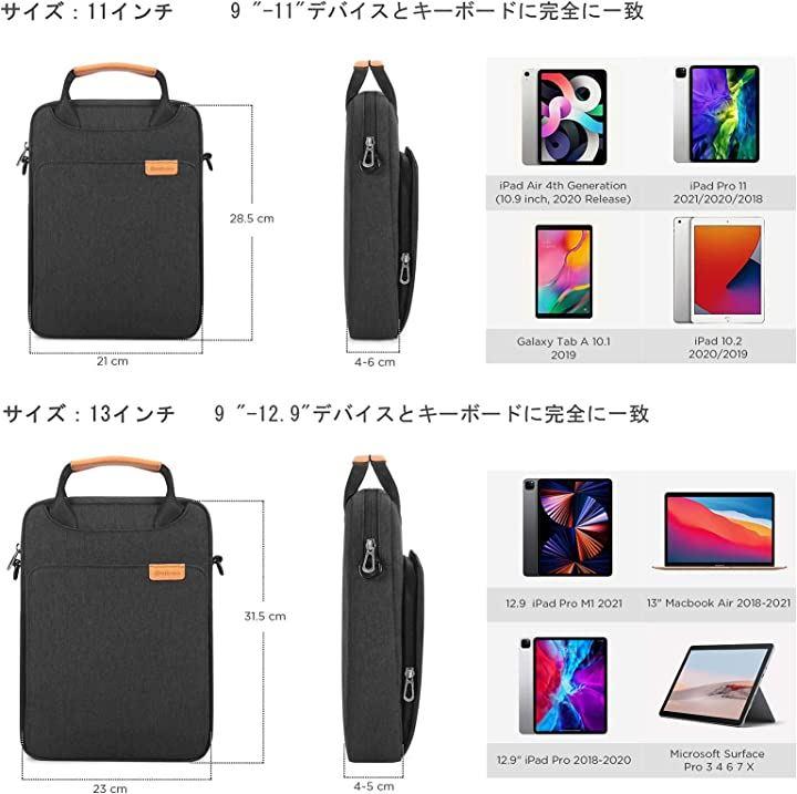 「寸法&互換性」外寸:21 x 28.5 x 4-6 cm / 8.3 x 11.2 x 1.6-2.4 inch (LxWxH),内寸:20 x 27.5 x 2.5 cm / 7.9 x 10.8 x 1 inch (LxWxH); メインコンパートメントの中の内ポケット:19 x 27 x 1.5 cm / 7.5 x 10.6 x 0.6 inch,と互換性があり9.7 10.5 11 iPad Pro, 10.2 iPad, 10.5 10.9 iPad Air, Surface Go 2, Surface 3, 11 Tab P11 Tablet / P11 Pro Tablet