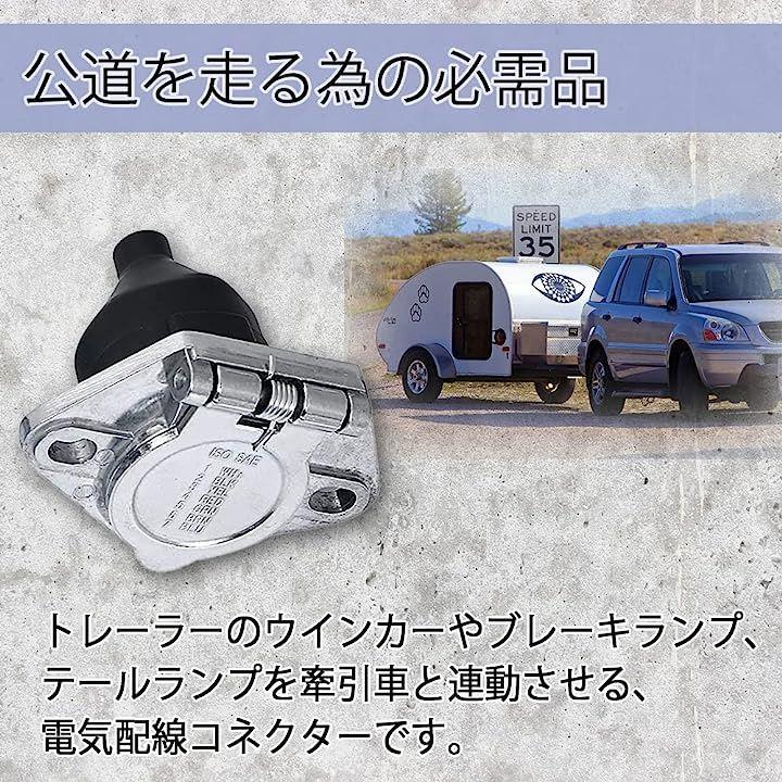 公道を走る為の必需品:トレーラーのウインカーやブレーキランプ、テールランプを牽引車と連動させる、電気配線コネクターです。