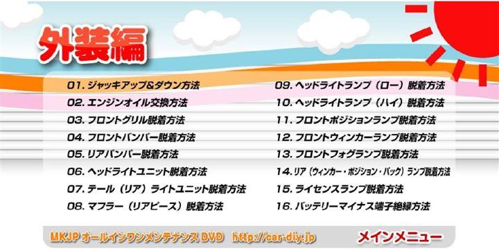 アルファード (20系) DVD 収録内容 : *外装関連* 1. ジャッキアップ&ダウン方法 2. エンジンオイル交換 3. フロントグリル脱着 4. フロントバンパー脱着 5. リアバンパー脱着 6. ヘッドライトユニット脱着 7. テール(リア)ライトユニット脱着 8. マフラー(リアピース)脱着 9. ヘッドライトランプ(ロー)脱着 10. ヘッドライトランプ(ハイ)脱着 11. フロントポジションランプ脱着 12. フロントウィンカーランプ脱着 13. フロントフォグランプ脱着 14. リア(ウィンカー・ポジション・バック)ランプ脱着方法 15. ライセンスランプ脱着 16. バッテリーマイナス端子絶縁 17. フロントシート脱着方法 18. Aピラー脱着 19. ピラースピーカー脱着 20. サイドスカッフプレート脱着 21. エアコンフィルター脱着方法 22. キーリモコン電池脱着 23. トランクトリム脱着 24. サンバイザー脱着 25. センターコンソールボックス脱着 26. ルームランプ脱着 27. 工具紹介