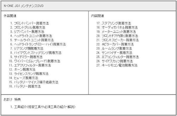 ・電球交換解説(バルブ・ウィンカーランプなど)バンパー交換方法・ヘッドライト交換方法・フロンドドア内張り脱着方法などなど、N-ONE JG1 のメンテナンス・各種パーツ交換方法・脱着方法を解説したDVD。