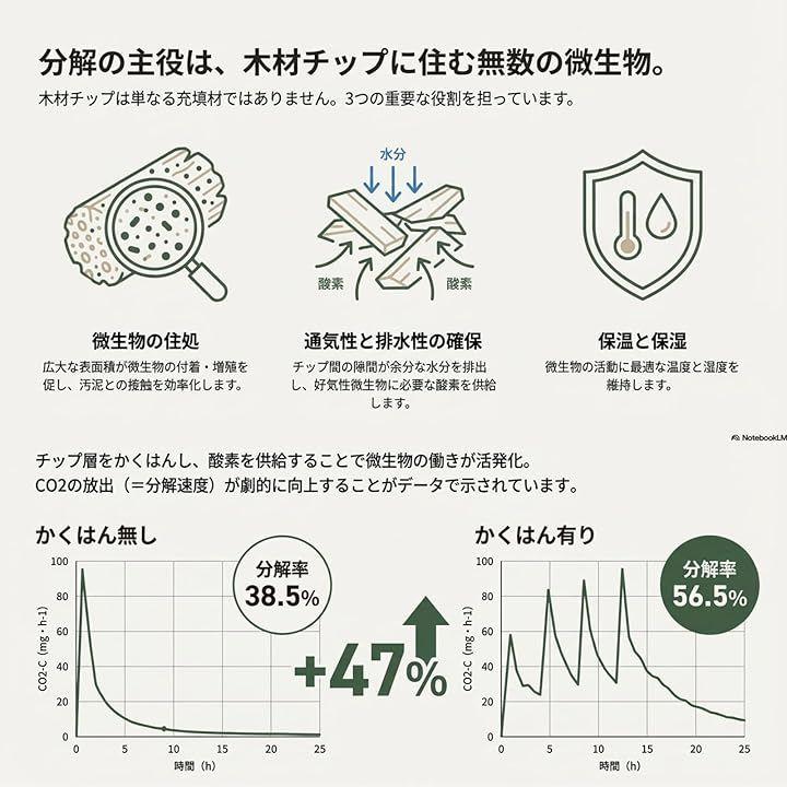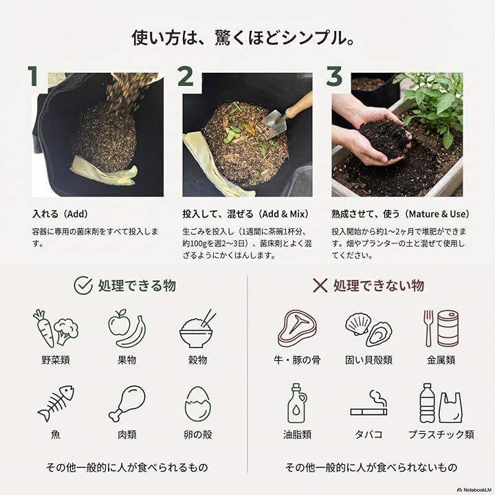 商品紹介:ご家庭の生ゴミを「資源」に変える微生物の力。 毎日出る生ゴミ、どうしていますか?この菌床材を使えば、生ゴミを微生物の力でクリーンに分解し、環境に優しい「堆肥」として再利用できます。