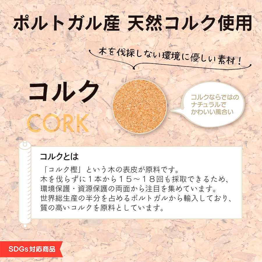 ※天然素材のコルクを使用しているため色合いやコルク粒などに若干の個体差がありイメージ写真は実際の色合いとは若干異なる場合がございますのでご了承ください。