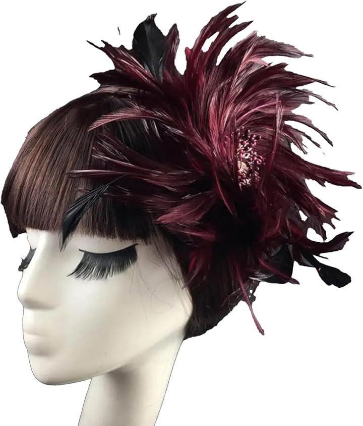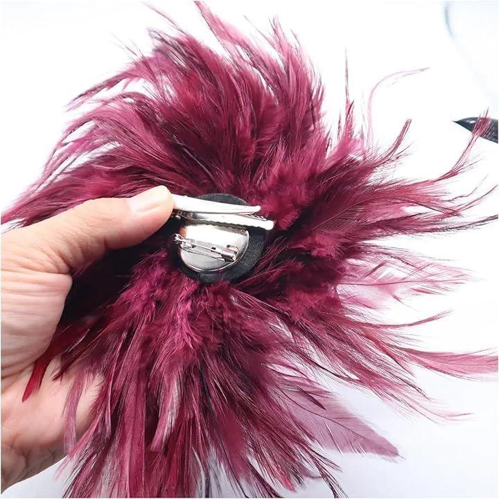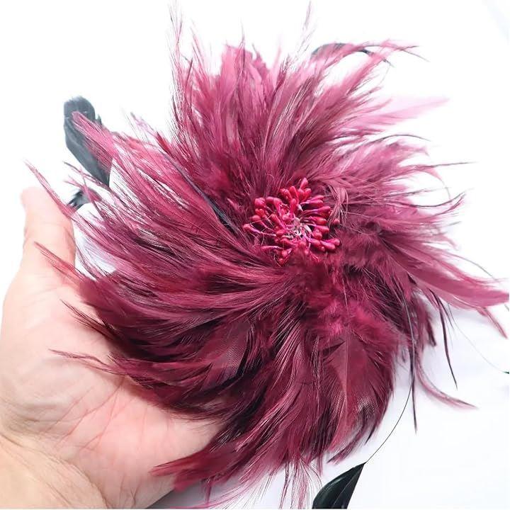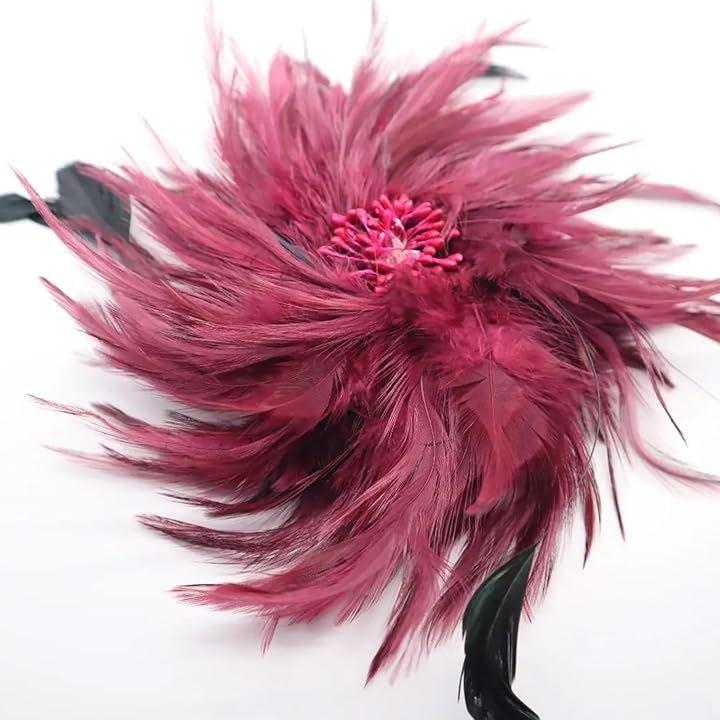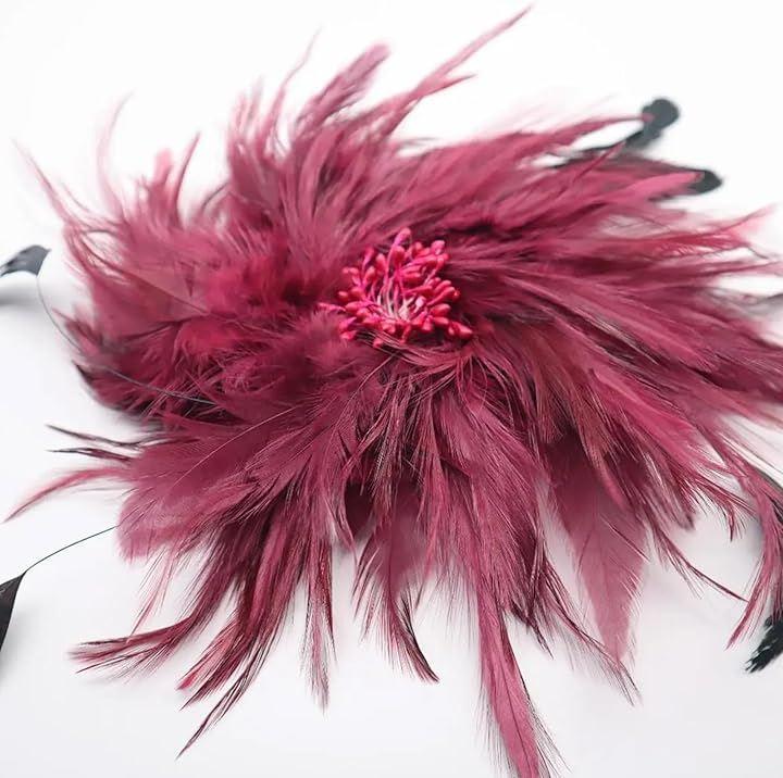 1. 「華やかなデザイン」 鮮やかな赤色のフェザーが目を引くこのヘッドドレスは、中心に輝くビーズとスパンコールで装飾された花のモチーフが特徴です。