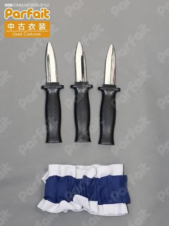 【セット内容】ワンピース、ブラウス、エプロン、首リボン、太もも飾り、おもちゃナイフ、カチューシャ【生地の種類】ポリエステル【コメント】HAコスプレ館製。比較的状態の良いメイド服衣装です。太もも飾りはベルト部にゴムが入っています。おもちゃナイフは刃先が引っ込む仕様です。ワンピースは背面ファスナーで着脱します。