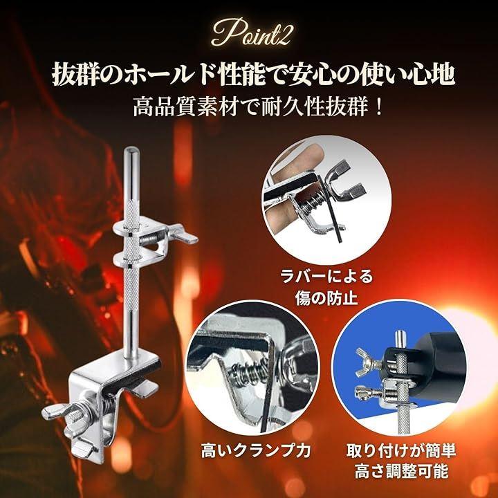 「高さ調整xラバー付きクランプで快適ポジションを確保」 ドラマーのプレイスタイルに合わせて柔軟に位置調整できるホルダーは、細かい角度変更もスムーズに対応。