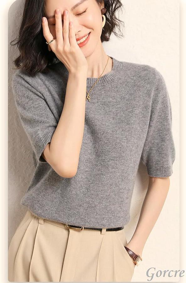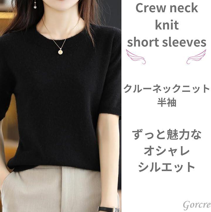クルーネックの半袖に、襟と袖がリブ仕様になって、フェミニンな大人の女性を演出。