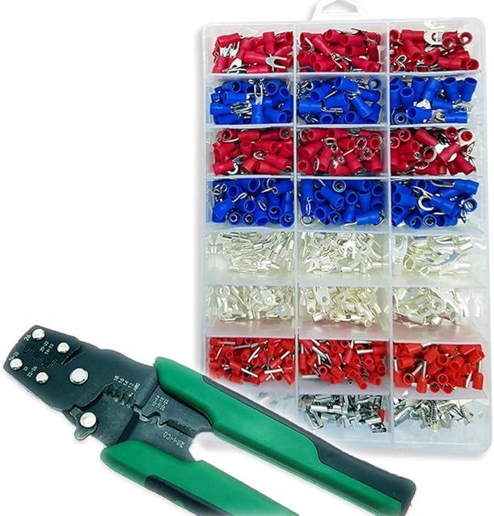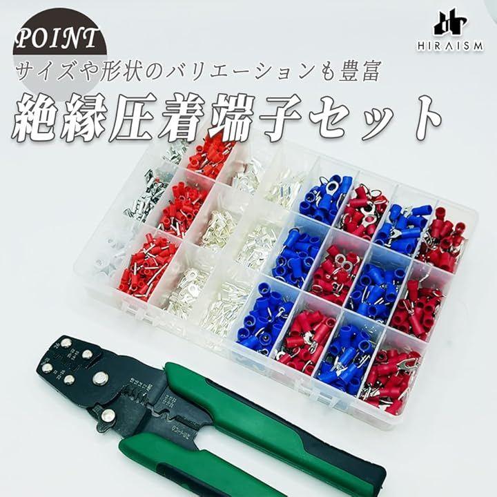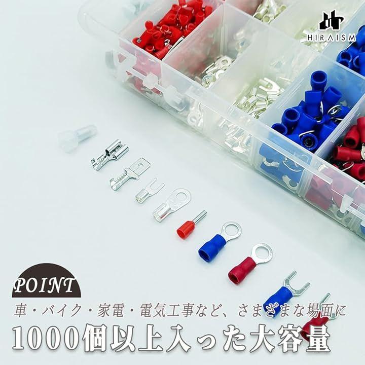 「商品内容」絶縁圧着端子セット <内容量>端子24種類:1000個/工具:1本 <カラー>赤・青(サイズ別) <素材>銅+PVC絶縁カバー <付属品>収納プラスチックケース