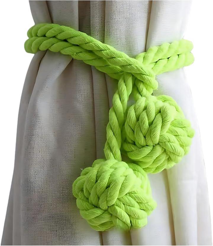 「簡単取り付けのカーテンタッセル」二つのボール状紐が付いているので、ロープを通すだけで簡単にカーテンを束ねられる便利なタッセル。