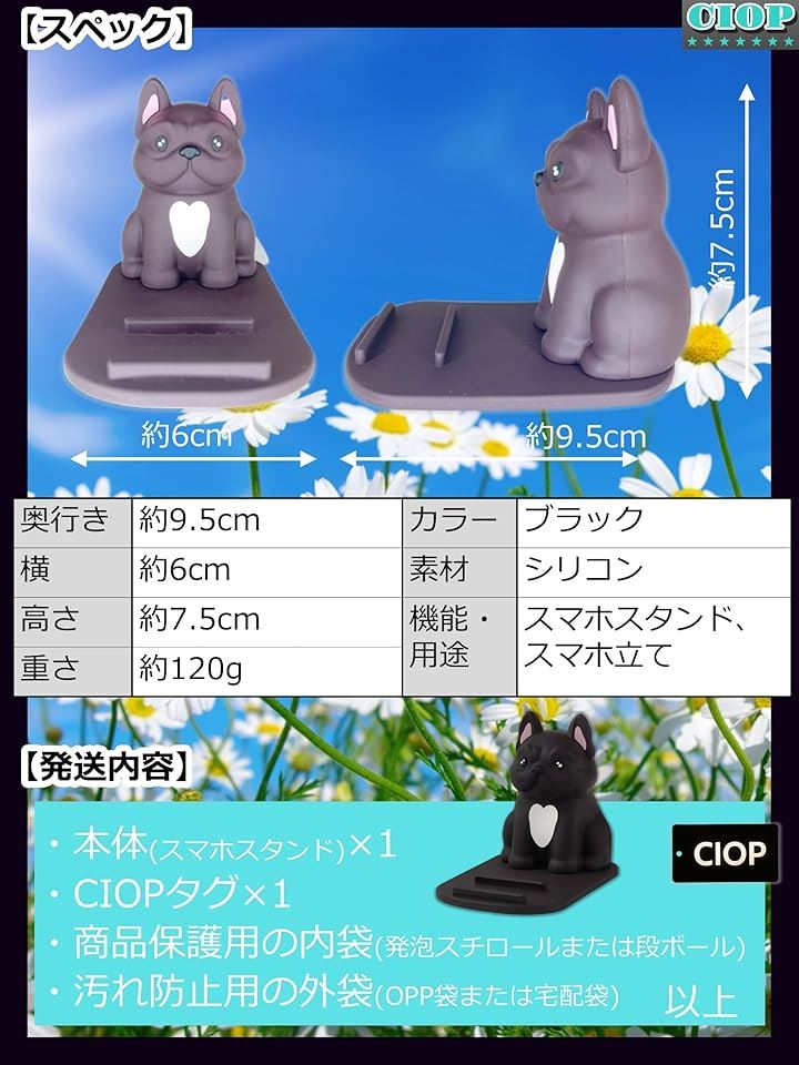 「サイズ」:奥行き9.5cmx横6cmx高さ7.5cm 「重さ」:約120g 「材質」:シリコン(生産国:中国) 「機能・用途」:スマホスタンド、スマホ立て
