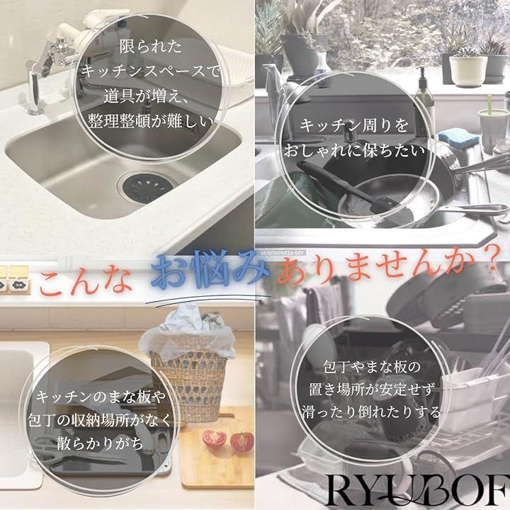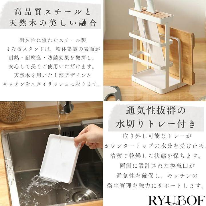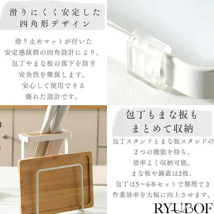 「包丁もまな板もまとめて収納」包丁スタンドとまな板スタンドの二つの機能を持ち、厚さ最大2cmのまな板や刃渡り11cmまでの包丁を効率よく収納可能。