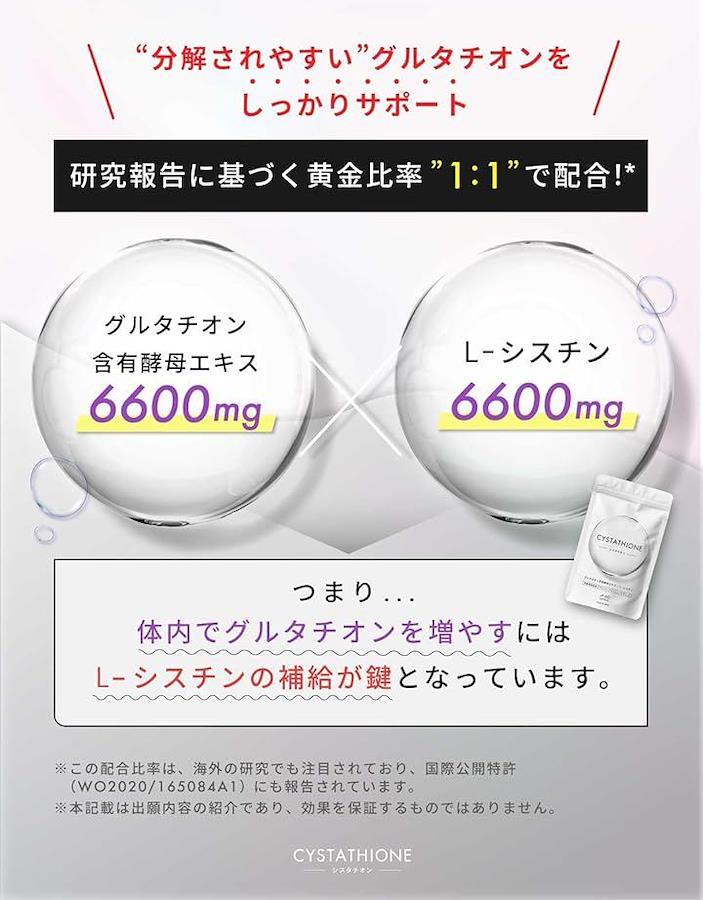「補助成分L-シスチンもたっぷり配合」グルタチオンの重要成分であるシステインを供給するためにL-シスチンを6,600mg配合。