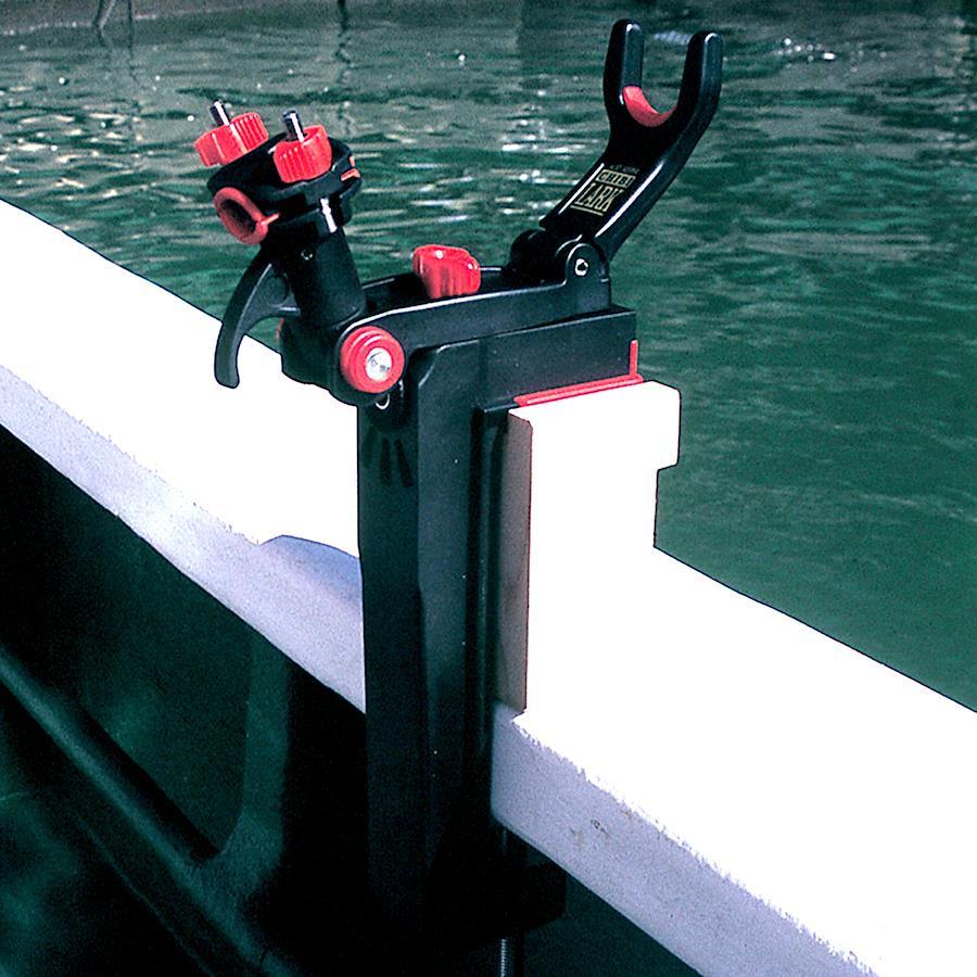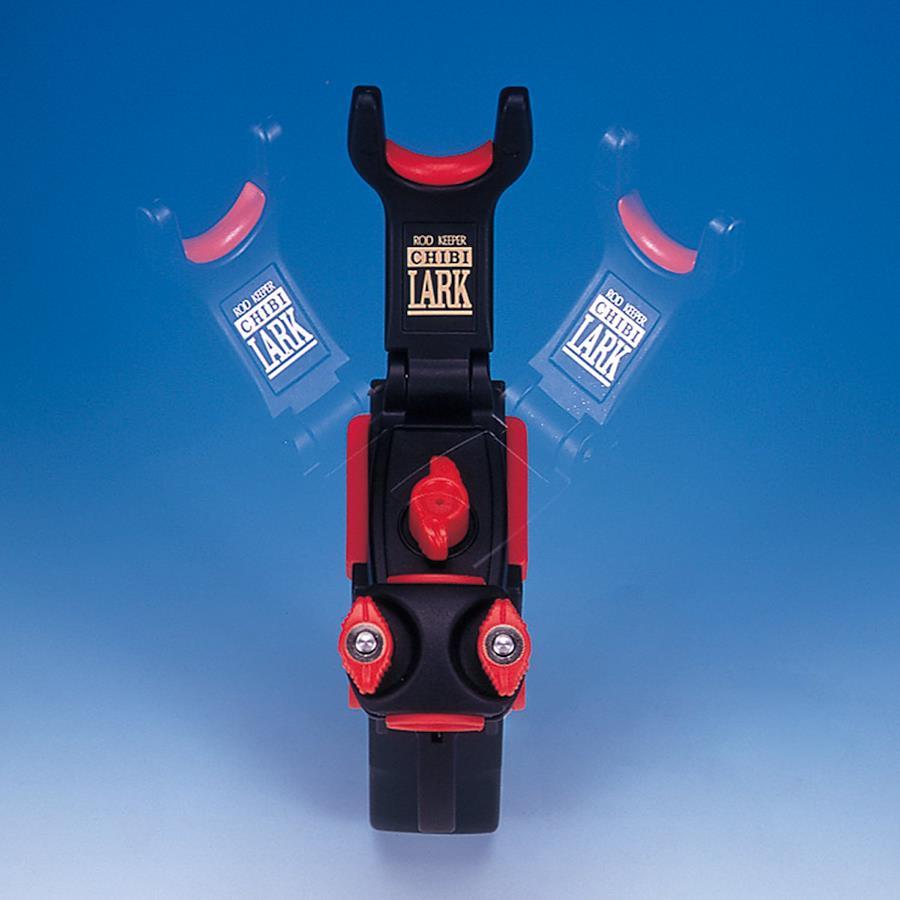 中・小物釣り専用でラーク竿受けシリーズのコンパクトなシリーズ。対象魚や釣り方に合わせて2種類の竿受け部がネジで交換できるので一台で二役をこなす。取りつけ幅16cmのワイドバージョンで船ベリを上下のノンスリップで挟み込むので左右のひねりや圧力にも安定度が優れています。また船べりの取付が速くなったクイックボルト、タテ・ヨコ取付、首振り、ハンドルリングなど基本的な機能付です。潮の流れに合わせて、竿受部は50度、3段階に調節できます。これなら狭い場所でもオマツリを避ける方向へ自在に対応できます。L型ハンドルに取り付け、クランプネジを指先でクルクル回せるので船べりへの脱着がスピーディーになります。添木を船べりの上側にセットすると腰の高さでロッドやリールを操作できます。
