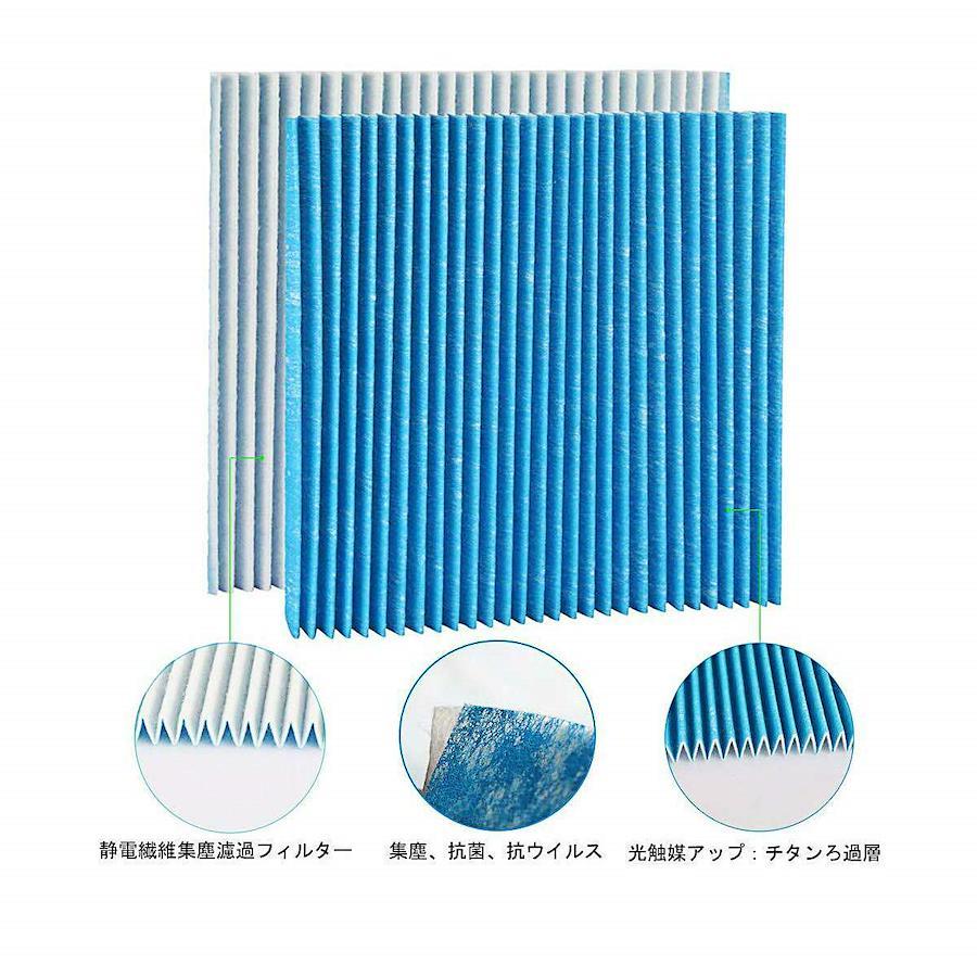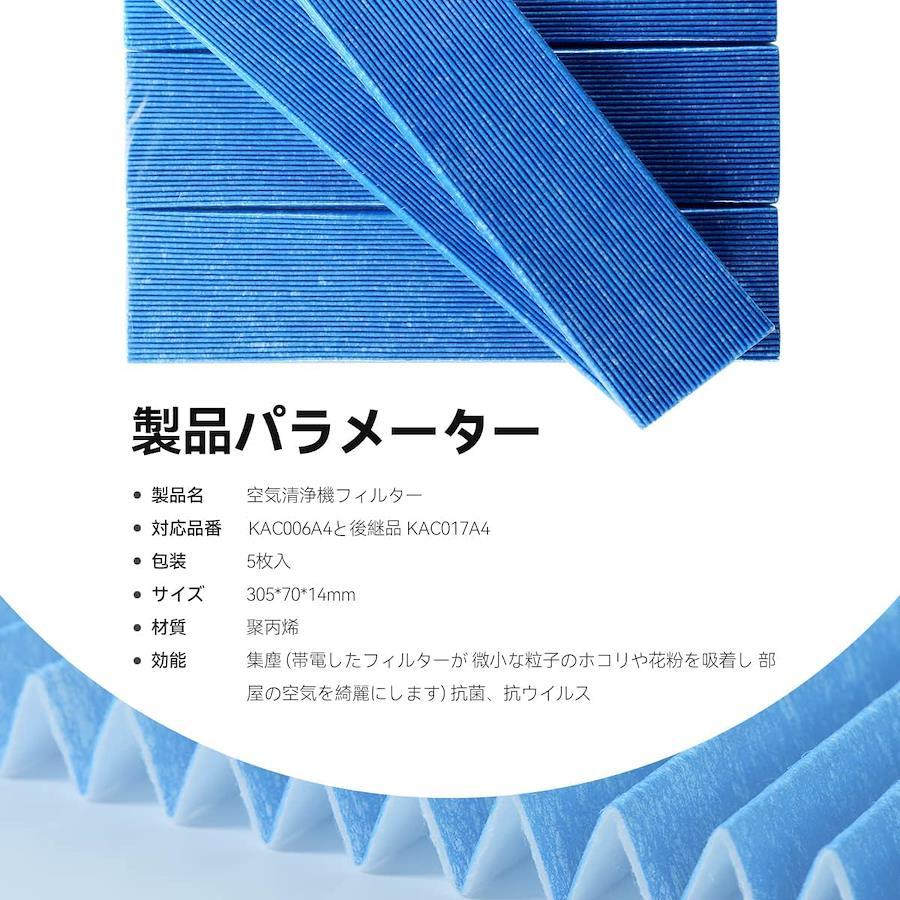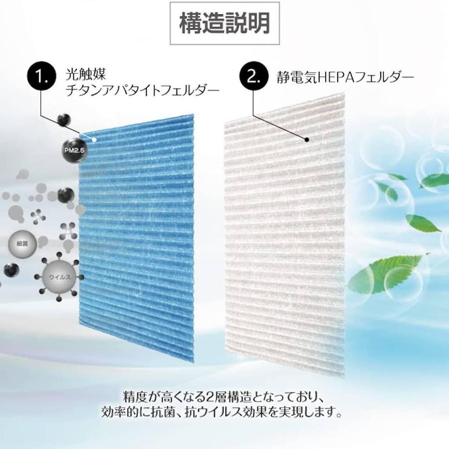 1:ダイキンの空気清浄機交換用フィルターは、KAC017A4とKAC006A4の後継品であり、空気中のさまざまな有害物質を効果的に除去するための高性能フィルターです。集じん、抗菌、抗ウィルス、脱臭、花粉対策などの多彩な機能を備え、快適で健康的な居住空間を提供します。 2:製品特徴として、ダブルフィルター構造である「プリーツ光触媒抗菌フィルター」と「帯電集じんHEAPフィルター」を組み合わせた2重濾過空清フィルターを採用しています。この組み合わせにより、カビ菌、ウィルス、ホコリ、花粉、ペットのフケ、PM2.5、ダニのふん・死がい、有害化学物質などのアレル物質を効果的に除去し、清潔で健康的な室内環境を実現します。 3:交換の目安として、プリーツフィルターは約3-4ヶ月ごとに交換してください。空清フィルターの交換時期は、使用方法や設置場所により異なります。ただし、空清フィルター交換ランプが点灯・点滅した場合は、フィルターを交換してください。見た目の汚れとフィルターの性能は比例しませんので、定期的な交換をお勧めします。フィルターを交換した後は、空清フィルター交換のリセットボタンを2秒間